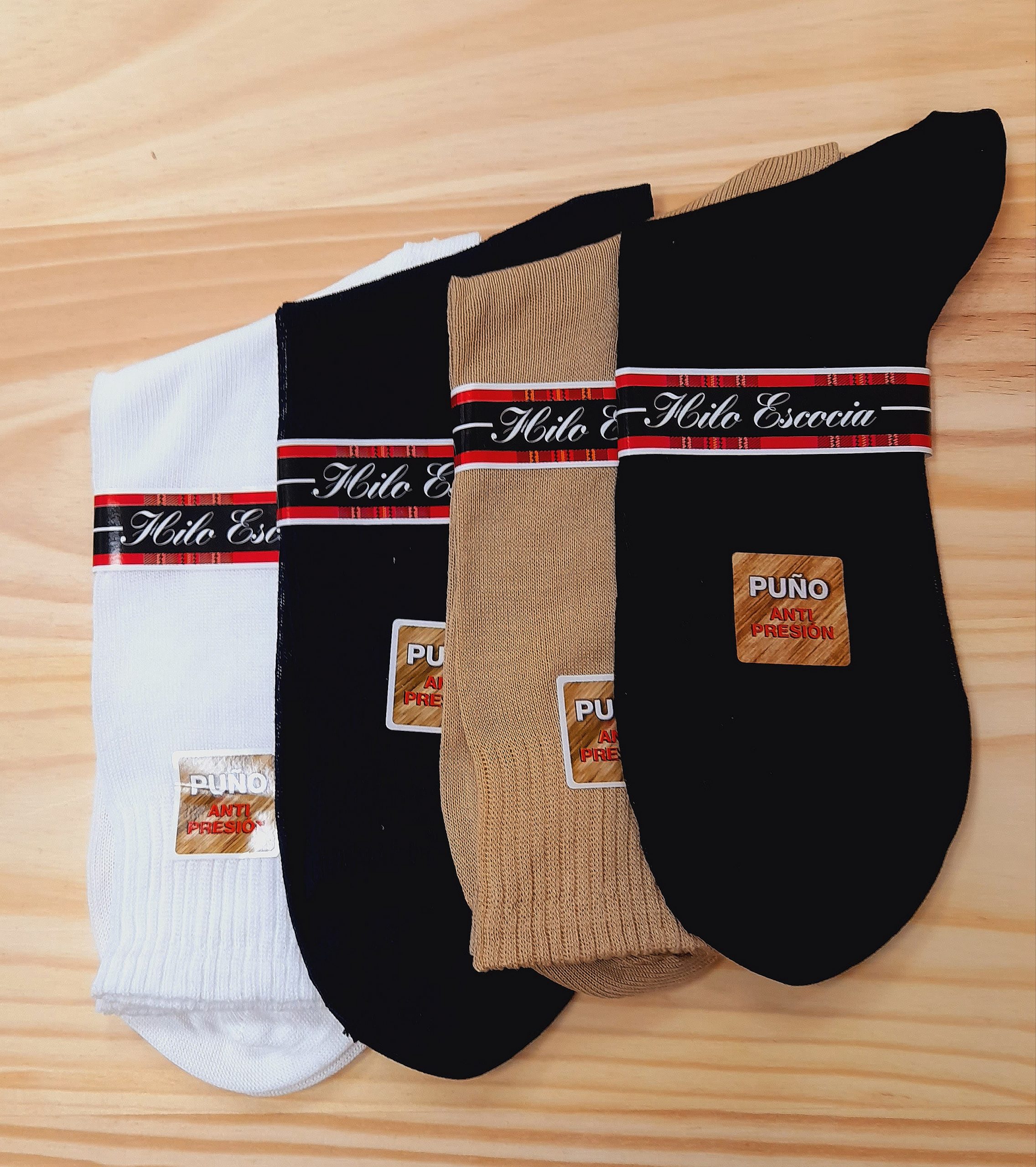 Calcetines de algodón 100%.El hilo de Escocia es un hilo de algodón que ha sufrido un proceso de mercerización.El hilo preparado se somete a un fuerte estiraje.Así se modifican la forma de las fibras y la celulosa del algodón.Para hacernos una idea debemos imaginarnos una manguera de las que usan los bomberos.Sin agua.Presentará una imagen totalmente plana.Pero si la llenamos de agua,el aspecto que tendrá es cilíndrica.Y así queda el hilo de algodón una vez ha sido mercerizado.Hinchado.Sólo que en su interior no hay agua,sino que solo hay un campo vacío.Esta fibra hueca en su interior la hace que se convierta en un gran absorbente de la humedad.La alta finura de las fibras de algodón egipcio y unidas a la mercerización asegura prendas muy resistentes.Tiene un tacto exquisito en contacto directo con la piel.Y las prendas realizadas con este tipo de material son muy elásticas. Transpirables y frescas.Calcetín hilo de Escocia son ideales para los meses de verano. Pero se pueden usar todo el año.Y están especialmente indicados para personas con piel sensible. Alérgicas. Pero sobretodo,personas que tienen problemas de circulación y todo les molesta. Los calcetines tienen el puño antipesión.Para que no tengamos que cortar el calcetín con las tijeras. Porque nos aprieta o nos molesta. Y estos calcetines están disponibles en 4 colores. En blanco,en beige. Y en azul marino y negro. Calcetines hilo de Escocia están fabricados en ESPAÑA.Y todo ello por solo 6,90.