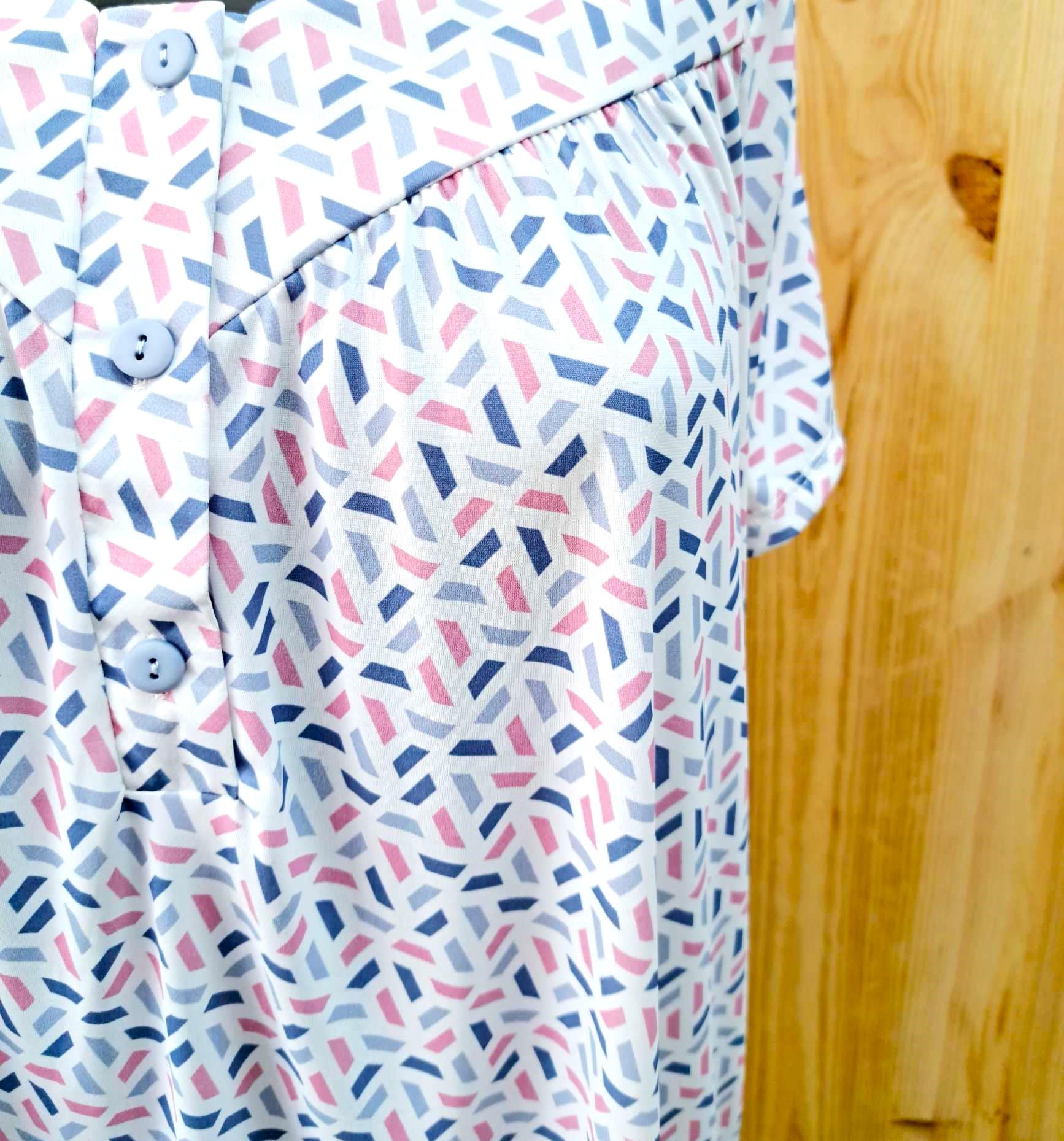 camisón manga corta poliamida hipoalergénico. Confeccionado en 100% poliamida.Para todo tipo de pieles.Especial para pieles sensibles y delicadas. No irrita la piel ni produce alergias.Suave al tacto.Un tejido fresco y ligero. Indicado para esas noches de extremo calor. El camisón mujer manga corta poliamida está confeccionado con un estampado discreto y suave sobre fondo blanco. Un estampado original,alegre y discreto..El camisón manga corta poliamida lo puedes poner muy fácilmente porque tiene abertura con 3 botones. Y así no te vas a despeinar. Y si te cuesta mover los brazos. o te cuesta mover los hombros este es tu camisón!! Porque se abre fácilmente. Como es de poliamida resbala. No se te quedará pegado al cuerpo.Con una manga corta con caída para que no se te pegue. Y así podemos dormir fresquitas y cómodas.Porque después de un día de mucho calor,lo que más apetece es darse una buena ducha. y ponerse fresquita. Con prendas sueltas y frescas.Por eso,este es tu camisón!!! Una prenda que resiste lavados hasta 60º grados. Y es de secado rápido. Y lo mejor de todo,¡¡¡no necesita plancha!!! Una buena noticia para todos nosotros. Sobre todo cuando suben los grados en nuestos hogares. Y puedes completar tu compra con la bata de manga corta abotonada de tejido ligero. Porque cuando nos levantamos por la mañana,nos gusta ponernos algo por encima mientras desayunamos. O por si llaman a la puerta. con este conjunto estarás ideal.O con el camisón de manga corta poliamida. Y también si te vas de viaje. Son prendas que no ocupan nada en la maleta. Y son prácticas,cómodas,y muy coquetas. Aunque tengamos unos años,a todas nos encanta sentirnos femeninas. Y tienes estas opciones sin salir de nuestra página web. Y todo es de Findel. Hecho en ESPAÑA.Un camisón estupendo a un precio increíble!!! Por solo 33,50euros!!!